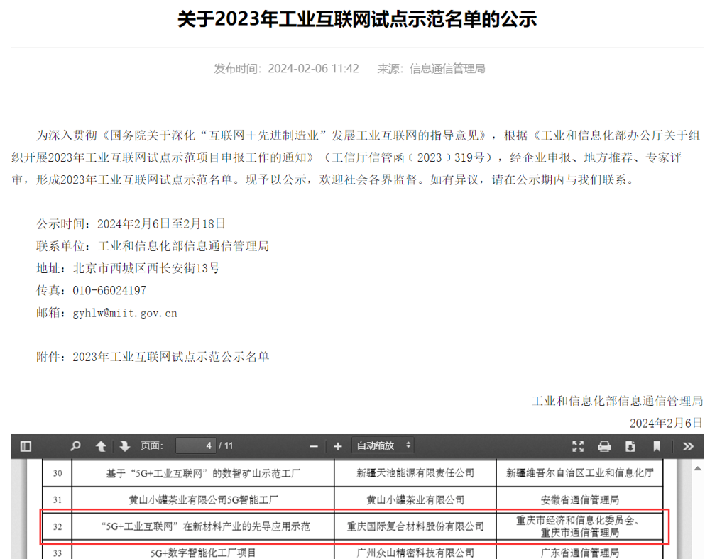 近期,国家工业和信息化部公示了2023年工业互联网试点示范名单,在推动产业现代化和数字变革的关键时刻,国际复材 “5G+工业互联网”在新材料产业的先导应用示范项目成功入选了工厂类试点-5G工厂试点名单,该成就标志着公司数字化建设工作得到了官方的高度认可。